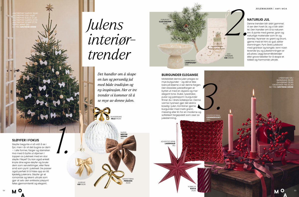 Sløyfer begynte vi så vidt å se i fjor, men i år vil det bugne av dem – i alle former, farger og størrelser. Hva med å bytte ut stjernen i toppen av juletreet med en stor sløyfe i fløyel? Du kan også enkelt knyte dine egne sløyfer og bruke dem som serviettringer, eller flere små som pynt i juletreet. De passer også perfekt til å friske opp en litt kjedelig julekrans. Sløyfer gir et romantisk og lekent uttrykk som gjør at selv den enkleste julepynt føles gjennomtenkt og elegant.