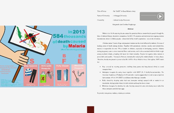 Children under 5 years of age and pregnant women are the worst affected by malaria. It is one of leading causes of death among children. Together with pneumonia, diarrhea, measles and malnutrition, malaria is responsible for over 70 % of deaths in children, especially in developing countries. Malaria during pregnancy causes severe maternal illness and anemia, and is also associated with low birth weight among newborn infants, a leading risk factor for infant mortality. Despite its negative sides, malaria is preventable and curable. Increased efforts are dramatically reducing the malaria burden in many places. Therefore, hereby we present a poster called Be SAFE to Keep Malaria Away. Our tagline, SAFE stands for: