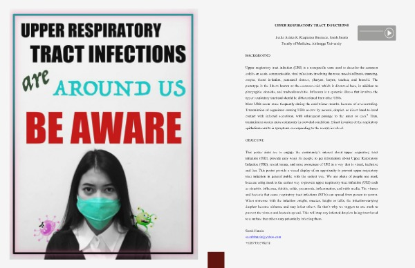 This poster aims are to engage the community’ s interest about upper respiratory tract infection( URI), provide easy ways for people to get information about Upper Respiratory Infection( URI), reveal issues, and raise awareness of URI in a way that is visual, inclusive and fun. This poster provide a visual display of an opportunity to prevent upper respiratory tract infection in general public with the easiest way. We use photo of people use mask because using mask is the easiest way to prevent upper respiratory tract infection( URI) such as sinusitis, influenza, rhinitis, colds, pneumonia, inflammation, and otitis media. The viruses and bacteria that cause respiratory tract infections( RTIs) can spread from person to person. When someone with the infection coughs, sneezes, laughs or talks, the infection-carrying droplets become airborne and may infect others. So that’ s why we suggest to use mask to prevent the viruses and bacteria spread. This will stop any infected droplets being transferred to a surface that others may potentially infecting them.