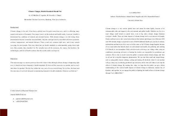 Climate change is a very serious global issue and cannot be taken lightly, because of its immeasurable risks and impacts to the environment and public health. Whether you live in a rural village, small island or coastal town, even in big cities, climate change threatens everyone’ s health. There are many impacts of climate change such as an increase in drought, floods, and heat waves, also vector borne diseases like malaria and dengue virus. Between 2030 and 2050 climate change is expected to cause 250,000 additional deaths per year due to malaria, malnutrition and heat stress. How can we let this come so far? Climate change happens because of our nasty habits that directly harm our environment and health, also polluting and emitting CO2 directly to our atmosphere. Daily activities such as driving a car, riding a bike, using air conditioner, processing red meat, or burning the trashes, are responsible for greenhouse gas emission. This is why we need to raise the public’ s awareness about climate change, and what we all can do to stop this dangerous phenomenon. We can start from small and simple things, such as using public transit, walking, cycling and turning off electricity when it’ s not needed, will go a long way in reducing greenhouse gas emission, and in turn will reduce even stop the effects of climate change. By making this video, we hope that the public can get a better understanding of the various health impacts of climate change in Indonesia, mainly City of Kendari, and together we can engage the public in fighting the health effects of climate change through“ Let’ s BREATHE!”