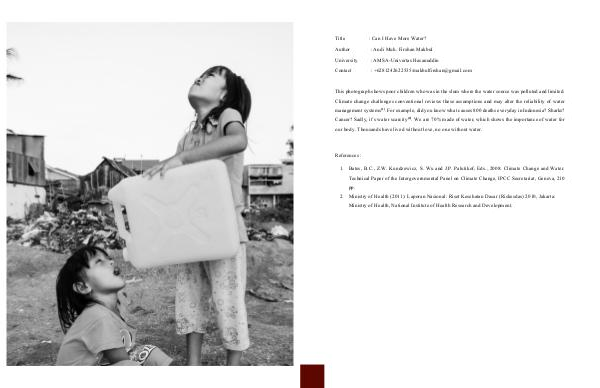 This photograph shows poor children who was in the slum where the water source was polluted and limited. Climate change challenges conventional reviews these assumptions and may alter the reliability of water management systems [ 1 ]. For example, did you know what causes 800 deaths everyday in Indonesia? Sharks? Cancer? Sadly, it’ s water scarcity [ 2 ]. We are 70 % made of water, which shows the importance of water for our body. Thousands have lived without love, no one without water.