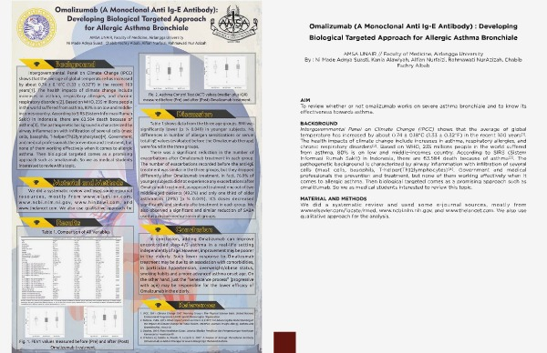 BACKGROUND Intergovernmental Panel on Climate Change( IPCC) shows that the average of global temperature has increased by about 0.74 ± 0.18 ° C( 1.33 ± 0.32 ° F) in the recent 100 years [ 1 ]. The health impacts of climate change include increases in asthma, respiratory allergies, and chronic respiratory disorders [ 2 ]. Based on WHO, 235 millions people in the world suffered from asthma, 80 % is on low and middle-incomes country. According to SIRS( Sistem Informasi Rumah Sakit) in Indonesia, there are 63.584 death because of asthma [ 3 ]. The pathogenetic background is characterized by airway inflammation with infiltration of several cells( mast cells, basophils, T-helper( Th) 2lymphocytes) [ 4 ]. Government and medical professionals the prevention and treatment, but none of them working effectively when it comes to allergic asthma. Then biological targeted comes as a promising approach such as omalizumab. So we as medical students interested to review this topic.