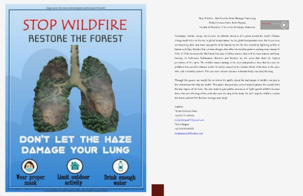 Through this poster, we would like to inform the public about the bad impact of wildfire not just to the environment but also our health. This poster also provides several ways to protect the society from the bad impact of the haze. We also want to gain public awareness to fight against wildfire because those who save the lung of the earth also save the lung of the body. So, let’ s stop the wildfire, restore the forest, and don ' t let the haze damage your lung!