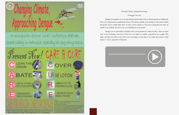 Dengue can’ t be annihilated completely, but it can be prevented to reduce its effect. There are many ways to prevent dengue, and some of them are very simple yet usually neglected by most people. This poster can show the public some ways to prevent dengue in hope that it can reduce the number of this disease’ s victims, especially in Indonesia.