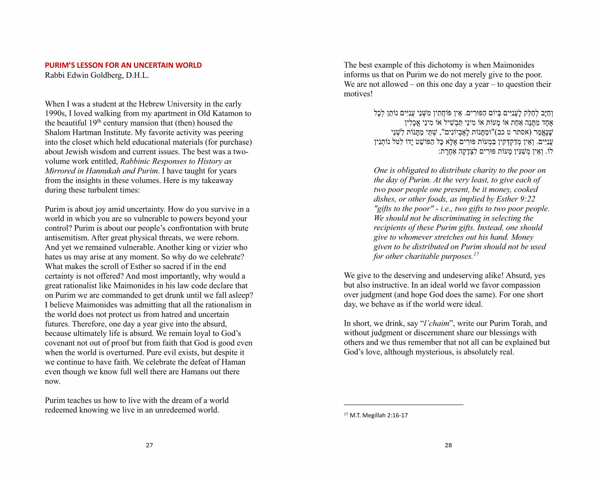 The best example of this dichotomy is when Maimonides informs us that on Purim we do not merely give to the poor . We are not allowed – on this one day a year – to question their motives !
