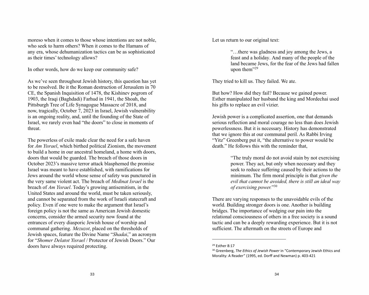The powerless of exile made clear the need for a safe haven for Am Yisrael , which birthed political Zionism , the movement to build a home in our ancestral homeland , a home with doors , doors that would be guarded . The breach of those doors in October 2023 ’ s massive terror attack blasphemed the promise Israel was meant to have established , with ramifications for Jews around the world whose sense of safety was punctured in the very same violent act . The breach of Medinat Israel is the breach of Am Yisrael . Today ’ s growing antisemitism , in the United States and around the world , must be taken seriously , and cannot be separated from the work of Israeli statecraft and policy . Even if one were to make the argument that Israel ’ s foreign policy is not the same as American Jewish domestic concerns , consider the armed security now found at the entrances of every diasporic Jewish house of worship and communal gathering . Mezuzot , placed on the thresholds of Jewish spaces , feature the Divine Name “ Shadai ,” an acronym for “ Shomer Delatot Yisrael / Protector of Jewish Doors .” Our doors have always required protecting .