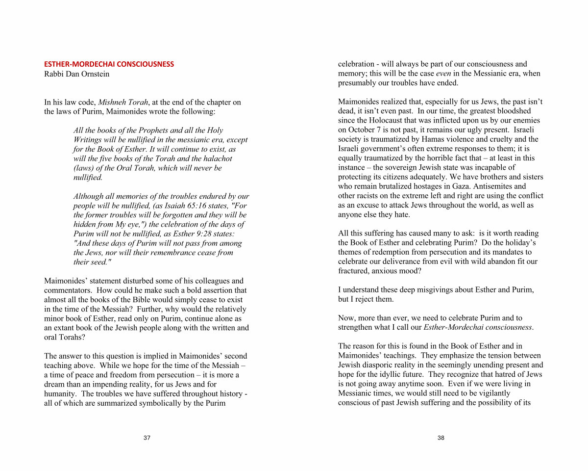 The reason for this is found in the Book of Esther and in Maimonides ’ teachings . They emphasize the tension between Jewish diasporic reality in the seemingly unending present and hope for the idyllic future . They recognize that hatred of Jews is not going away anytime soon . Even if we were living in Messianic times , we would still need to be vigilantly conscious of past Jewish suffering and the possibility of its