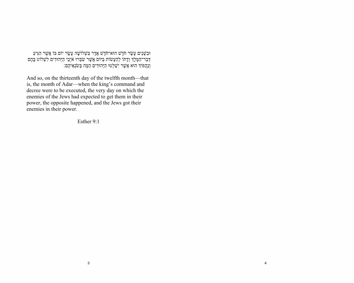 And so , on the thirteenth day of the twelfth month — that is , the month of Adar — when the king ’ s command and decree were to be executed , the very day on which the enemies of the Jews had expected to get them in their power , the opposite happened , and the Jews got their enemies in their power .