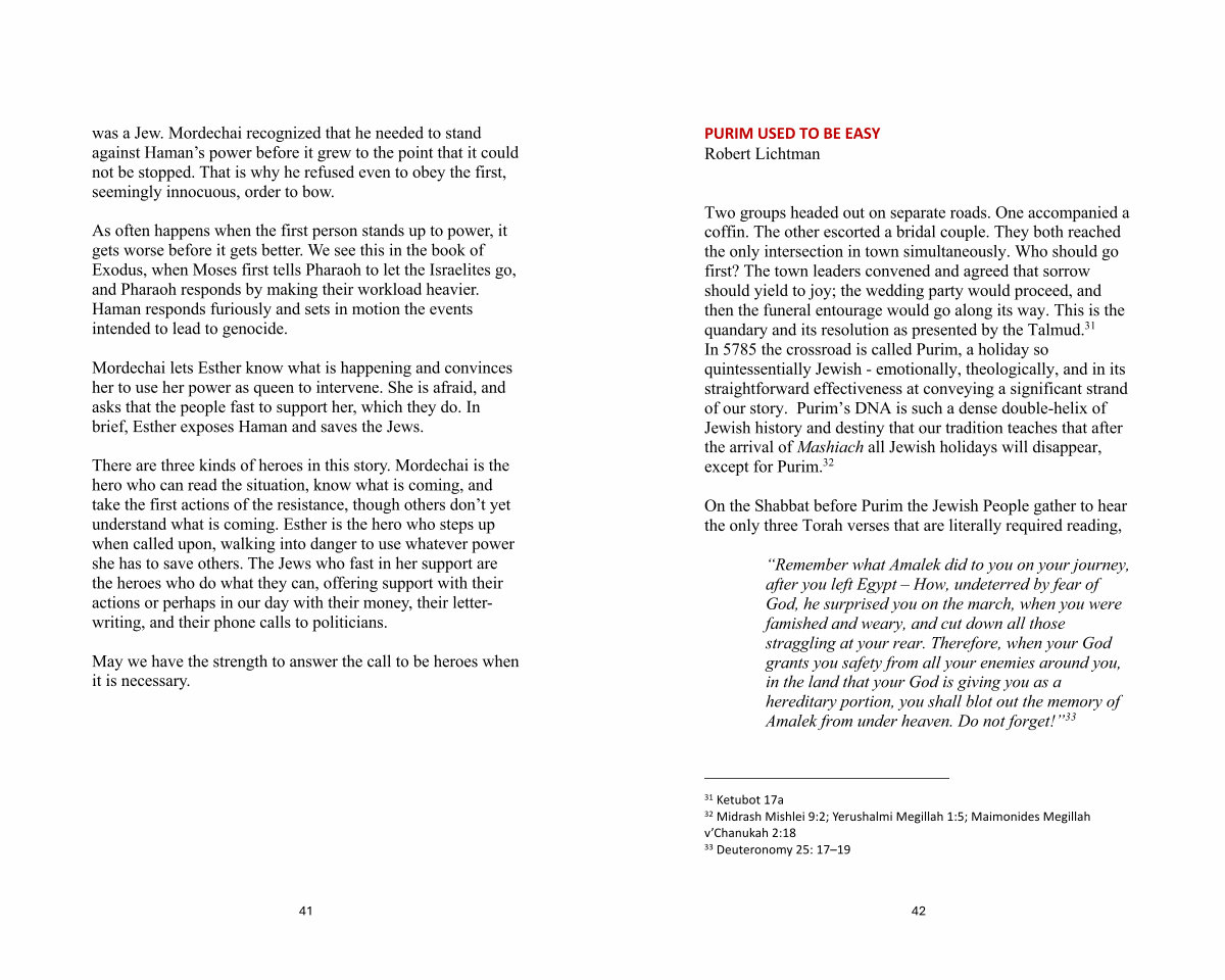 Two groups headed out on separate roads . One accompanied a coffin . The other escorted a bridal couple . They both reached the only intersection in town simultaneously . Who should go first ? The town leaders convened and agreed that sorrow should yield to joy ; the wedding party would proceed , and then the funeral entourage would go along its way . This is the quandary and its resolution as presented by the Talmud . 31 In 5785 the crossroad is called Purim , a holiday so quintessentially Jewish - emotionally , theologically , and in its straightforward effectiveness at conveying a significant strand of our story . Purim ’ s DNA is such a dense double-helix of Jewish history and destiny that our tradition teaches that after the arrival of Mashiach all Jewish holidays will disappear , except for Purim . 32