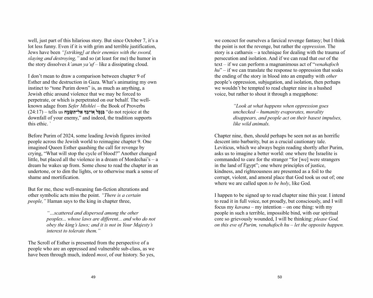 I happen to be signed up to read chapter nine this year . I intend to read it in full voice , not proudly , but consciously , and I will focus my kavana – my intention – on one thing : with my people in such a terrible , impossible bind , with our spiritual core so grievously wounded , I will be thinking : please God , on this eve of Purim , venahafoch hu – let the opposite happen .