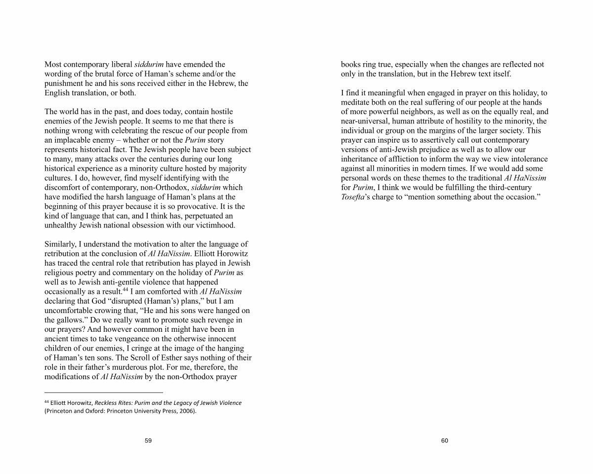 I find it meaningful when engaged in prayer on this holiday , to meditate both on the real suffering of our people at the hands of more powerful neighbors , as well as on the equally real , and near-universal , human attribute of hostility to the minority , the individual or group on the margins of the larger society . This prayer can inspire us to assertively call out contemporary versions of anti-Jewish prejudice as well as to allow our inheritance of affliction to inform the way we view intolerance against all minorities in modern times . If we would add some personal words on these themes to the traditional Al HaNissim for Purim , I think we would be fulfilling the third-century Tosefta ’ s charge to “ mention something about the occasion .”