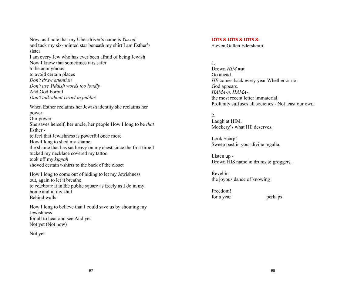 When Esther reclaims her Jewish identity she reclaims her power Our power She saves herself , her uncle , her people How I long to be that Esther - to feel that Jewishness is powerful once more How I long to shed my shame , the shame that has sat heavy on my chest since the first time I tucked my necklace covered my tattoo took off my kippah shoved certain t-shirts to the back of the closet
