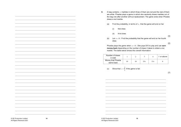 8 . A bag contains n marbles in which three of them are red and the rest of them are white . Phoebe plays a game in which she randomly draws marbles out of the bag one after another without replacement . The game ends when Phoebe draws a red marble .