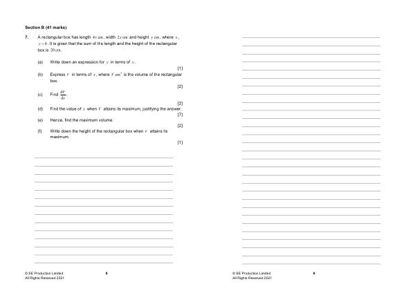 Section B ( 41 marks ) 7 . A rectangular box has length 4x cm , width 2x cm and height y cm , where x , y � 0. It is given that the sum of the length and the height of the rectangular box is 20 cm .