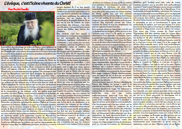 détaillées qu’il faudrait pour cela, mais, de toutes manières, j’estime que ce procédé était profondément incorrect. C’était traiter l’évêque comme une personnalité laïque, comme un fonctionnaire de la République. C’est inadmissible de la part de fidèles orthodoxes. Et c’est pour cela que j’ai demandé à tous les fidèles qui m’ont demandé conseil de refuser de signer cette lettre ouverte. L’évêque doit toujours être vénéré, respecté, car il est pour son diocèse l’icône vivante du Christ comme l’higoumène dans le monastère, et non un fonctionnaire. Il existe une particularité du typikon, qui veut que lorsque l’on entre dans la nef d’une église monastique, on aille d’abord faire la métanie à l’higoumène, avant de vénérer les icônes. C’est parce que l’icône vivante du Christ qu’est l’higoumène, doit être vénérée avant les icônes elles-mêmes. Cela ne veut pas dire qu’en lui-même l’higoumène est quelqu’un de plus vénérable, de particulièrement saint. Il devrait l’être, mais la faiblesse humaine reste là, et ce n’est pas à nous d’en juger. Il y a des usages qui doivent être respectés parce qu’ils sont profondément significatifs. Je me souviendrais toujours d’une parole d’un Ancien de l’Athos à qui je demandais conseil pour notre nouvelle fondation monastique en France, et il m’a dit : « Le premier conseil que je vais vous donner c’est de respecter le typikon, c’est-à-dire les règles de la Liturgie, les règles de comportement dans l’Église, les saint canons », et il a ajouté : « c’est cela qui vous donnera l’esprit de l’Église ». L’esprit de l’Église, ce n’est pas un esprit « profane », l’Église, c’est déjà le ciel sur la terre, l’Église c’est déjà tout le monde de la résurrection qui est présent parmi nous. Et il est très significatif que, dans l’Évangile, les femmes aient ce rôle de représenter l’Église, l’Église épouse du Christ. Ce n’est pas elles que le Christ a choisies comme apôtres, même si certaines ont le titre, comme sainte Marie Madeleine, « égale aux apôtres ». Ce n’est pas sur le même plan. Les saintes Femmes représentent l’ensemble des fidèles, représentent l’Église, mais non pas dans la fonction d’autorité. Alors que les apôtres, eux, sont la pierre sur laquelle est construite l’Église. Et, c’est pourquoi les évêques, auxquels les apôtres ont transmis leur autorité, ont cette mission première d’annoncer, de perpétuer à travers les siècles le témoignage des apôtres qui ont vu le Christ ressuscité. Ce témoignage est le fondement et la base de l’Église, sans aucun doute.