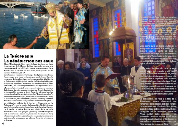 Nous avons été baptisés dans de l'eau sainte: sainte parce qu'elle a été bénie, sainte parce qu'elle alimente la vie, sainte parce qu'elle est le berceau et l'essence de toute vie. Par le baptême, nous sommes devenus chrétiens, baptisés dans l'Esprit Saint de Dieu. L'idée maîtresse qui nous est transmise par la fête de la Théophanie est la suivante: Jésus est baptisé mais nous le sommes aussi, baptisés en son nom et au nom de Dieu le père et du Saint Esprit.