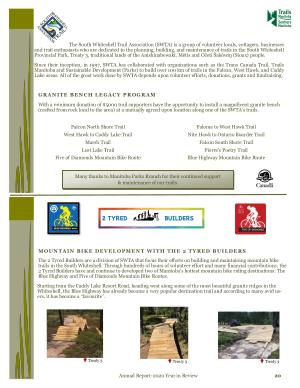 The 2 Tyred Builders are a division of SWTA that focus their efforts on building and maintaining mountain bike trails in the South Whiteshell . Through hundreds of hours of volunteer effort and many financial contributions , the 2 Tyred Builders have and continue to developed two of Manitoba ' s hottest mountain bike riding destinations : The Blue Highway and Five of Diamonds Mountain Bike Routes .