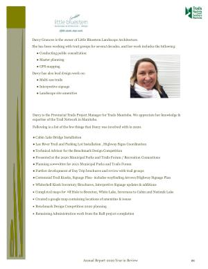 Darcy is the Provincial Trails Project Manager for Trails Manitoba . We appreciate her knowledge & expertise of the Trail Network in Manitoba .