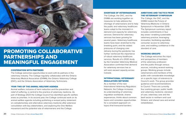 AMBITIONS AND TACTICS FROM THE VETERINARY SYMPOSIUM The College , the OVC , and the OVMA hosted the Future of Veterinary Medicine in Ontario Symposium in November 2019 . The Symposium summary report includes commitments in four key areas — enabling sustainable veterinary practice ; leveraging innovation ; facilitating equitable consumer access to veterinary care ; and instilling confidence in the standard of care .