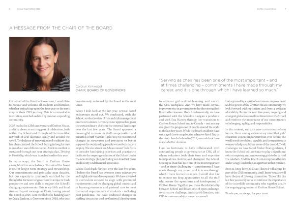 In many ways , the Board at Crofton House exemplifies this same balance . The role of the Board is one of longer-term strategy and stewardship . Our commitments and principles span decades , but our capacity is constantly enriched by the thoughtful turnover of governors that injects fresh perspective and new skills to support the School ’ s changing requirements . This is my fifth and final Annual Report message as Chair , having joined the Board in 2015 . I am thrilled to be handing over to Craig Lindsay , a Governor since 2018 , who was unanimously endorsed by the Board as the next Chair .