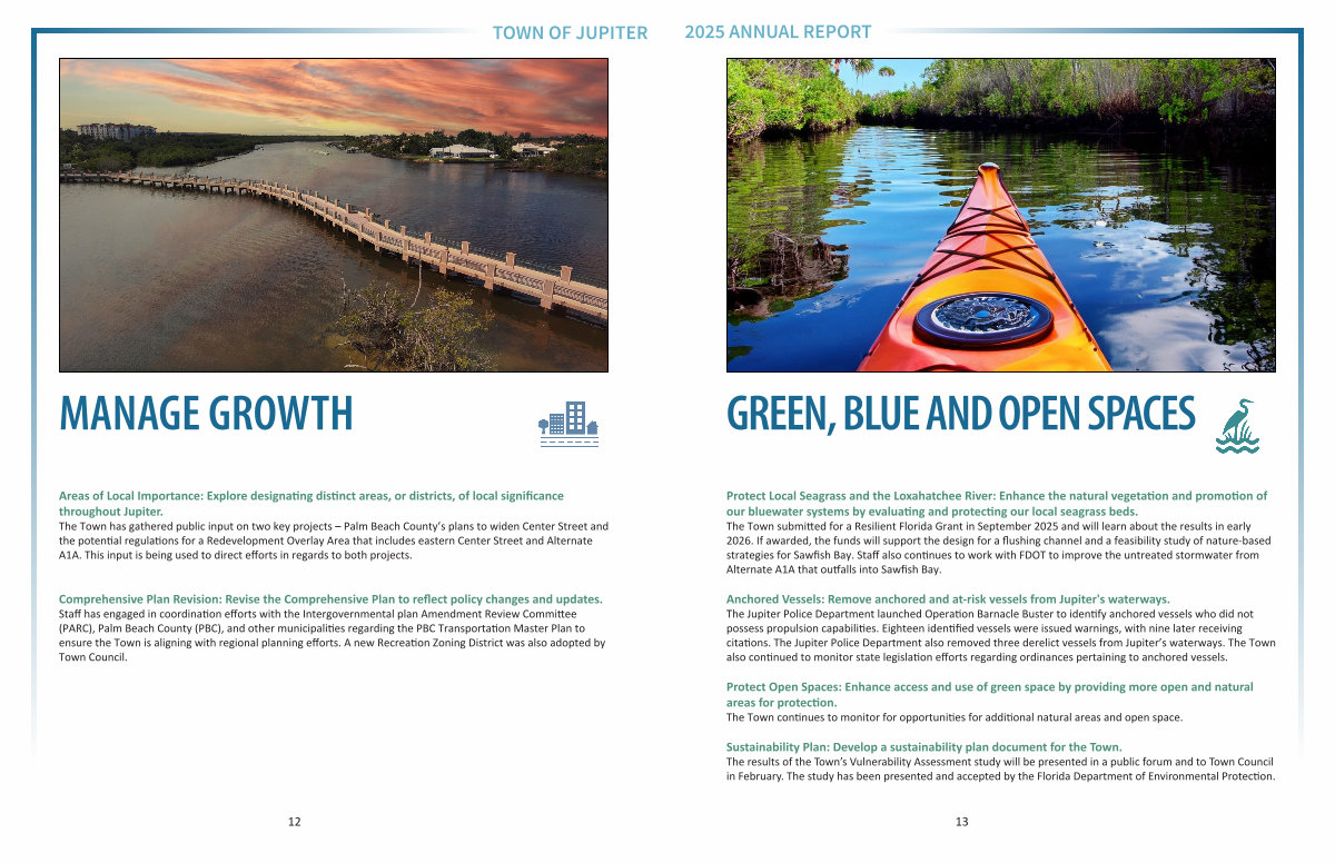 Protect Local Seagrass and the Loxahatchee River: Enhance the natural vegetation and promotion of our bluewater systems by evaluating and protecting our local seagrass beds. The Town submitted for a Resilient Florida Grant in September 2025 and will learn about the results in early 2026. If awarded, the funds will support the design for a flushing channel and a feasibility study of nature-based strategies for Sawfish Bay. Staff also continues to work with FDOT to improve the untreated stormwater from Alternate A1A that outfalls into Sawfish Bay.
