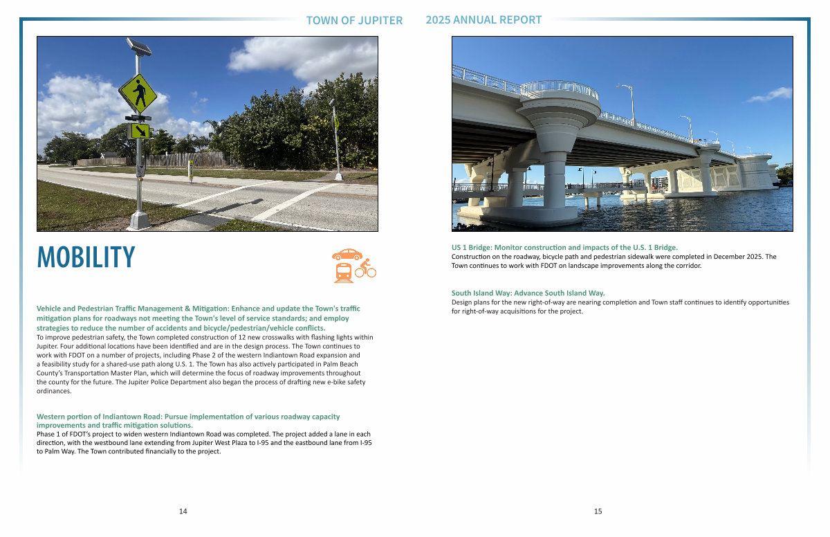 US 1 Bridge: Monitor construction and impacts of the U. S. 1 Bridge. Construction on the roadway, bicycle path and pedestrian sidewalk were completed in December 2025. The Town continues to work with FDOT on landscape improvements along the corridor.