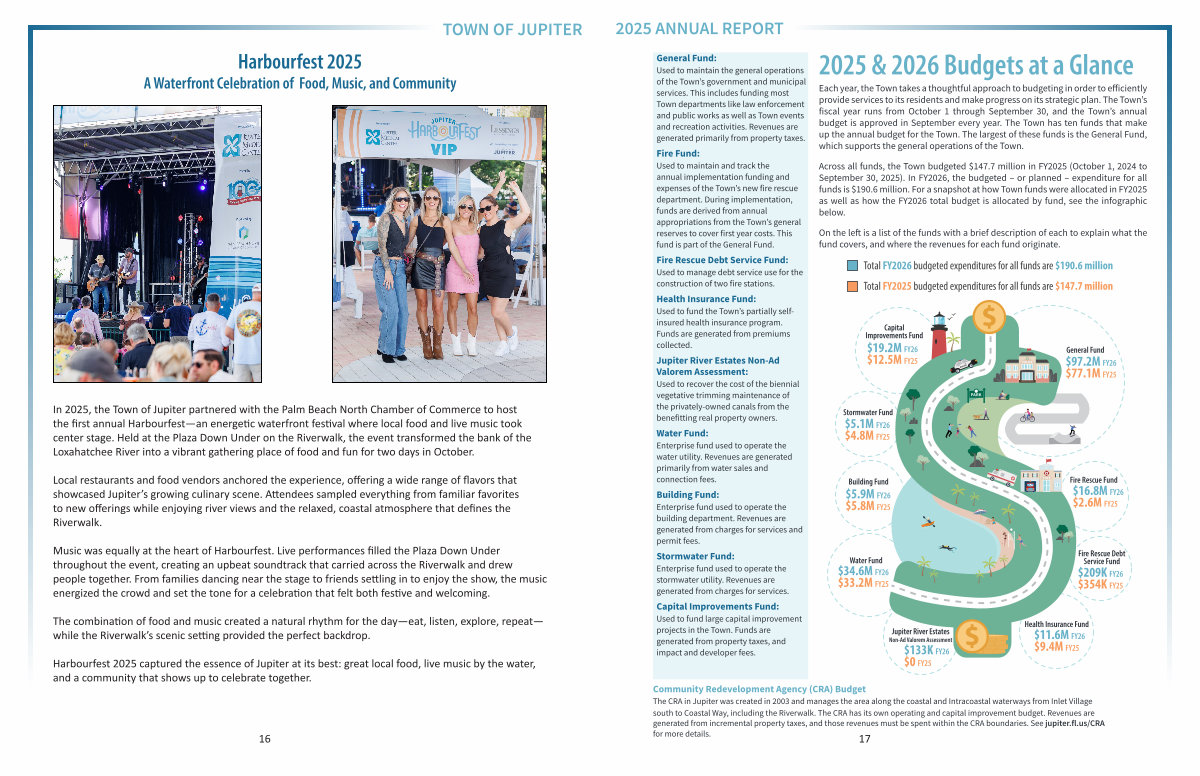 Community Redevelopment Agency( CRA) Budget The CRA in Jupiter was created in 2003 and manages the area along the coastal and Intracoastal waterways from Inlet Village south to Coastal Way, including the Riverwalk. The CRA has its own operating and capital improvement budget. Revenues are generated from incremental property taxes, and those revenues must be spent within the CRA boundaries. See jupiter. fl. us / CRA for more details.