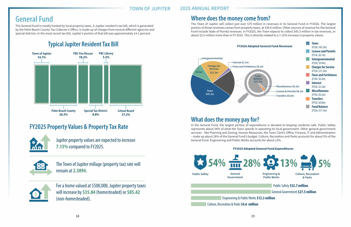 The General Fund is mostly funded by local property taxes. A Jupiter resident’ s tax bill, which is generated by the Palm Beach County Tax Collector ' s Office, is made up of charges from several different agencies and special districts. In the most recent tax bill, Jupiter’ s portion of that bill was approximately 14.1 percent.
