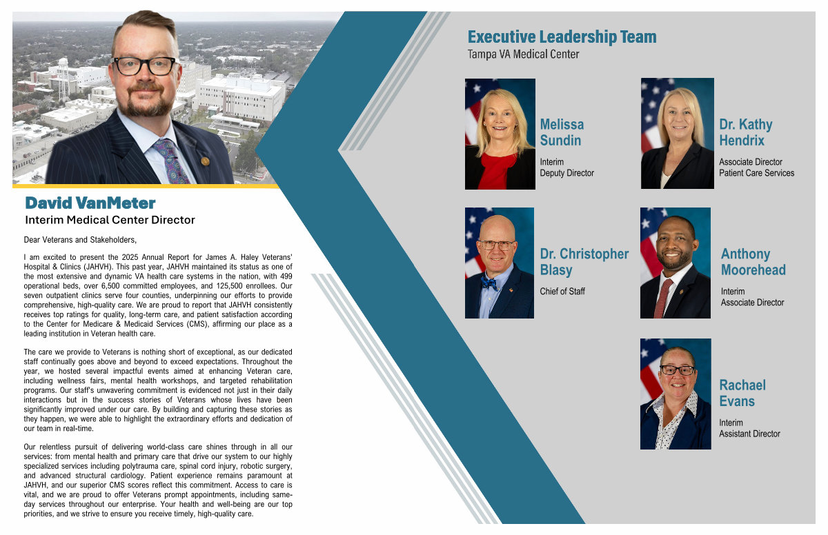I am excited to present the 2025 Annual Report for James A. Haley Veterans ' Hospital & Clinics( JAHVH). This past year, JAHVH maintained its status as one of the most extensive and dynamic VA health care systems in the nation, with 499 operational beds, over 6,500 committed employees, and 125,500 enrollees. Our seven outpatient clinics serve four counties, underpinning our efforts to provide comprehensive, high-quality care. We are proud to report that JAHVH consistently receives top ratings for quality, long-term care, and patient satisfaction according to the Center for Medicare & Medicaid Services( CMS), affirming our place as a leading institution in Veteran health care.