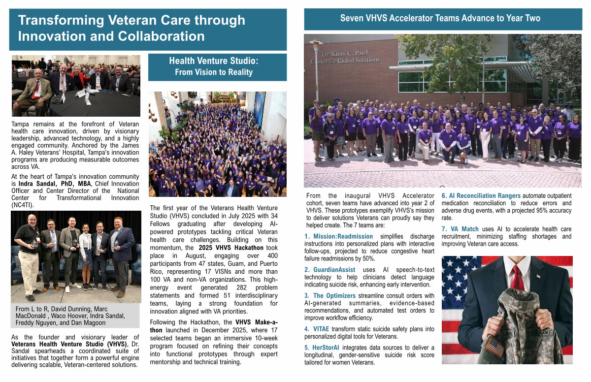 From the inaugural VHVS Accelerator cohort, seven teams have advanced into year 2 of VHVS. These prototypes exemplify VHVS’ s mission to deliver solutions Veterans can proudly say they helped create. The 7 teams are: