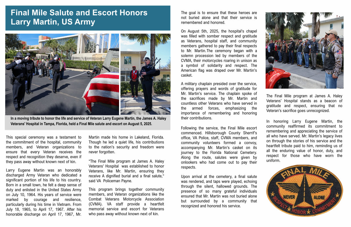 In a moving tribute to honor the life and service of Veteran Larry Eugene Martin, the James A. Haley Veterans ' Hospital in Tampa, Florida, held a Final Mile salute and escort on August 5, 2025.