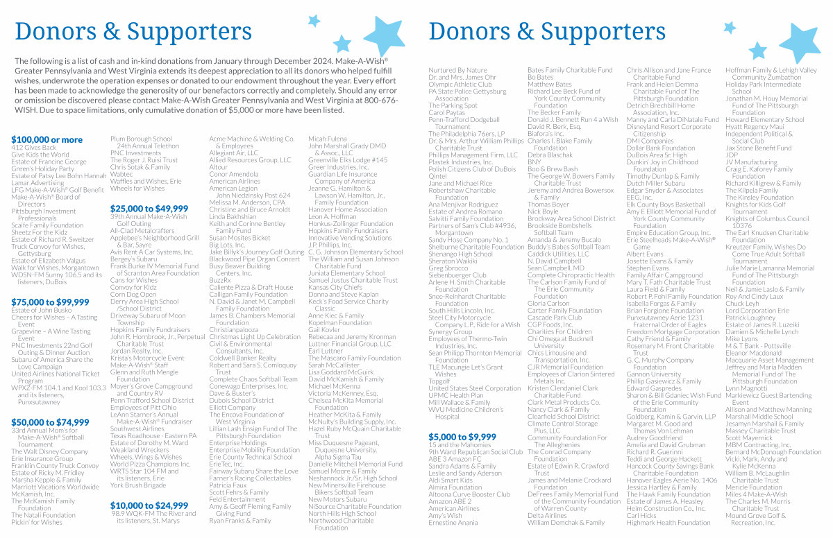 Bates Family Charitable Fund Bo Bates Matthew Bates Richard Lee Beck Fund of York County Community Foundation The Becker Family Donald J. Bennett Run 4 a Wish David R. Berk, Esq. Biafora’ s Inc. Charles I. Blake Family