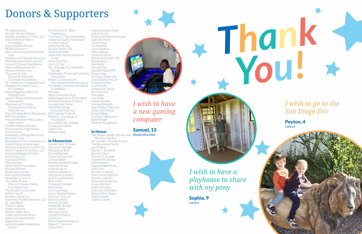 Moorthy Families Mr. and Mrs. Tony Benintend The Benintend Family Jacob Billyk Dennis C. Brechbill Hannah Cline Theresa A. Dunlap Timothy M. Dunlap Nikki Einhorn Saige Elizabeth Fohl Jack Fultz Brynlee A Jacoby Nancy Kratz-Minnich Dominic Lettrich Kara and Pat Manion Bruce Marshall Katee Monahan Kiara Izora Reinoehl Selena Marie Sleppy Jessica Smeltz Judith A. Stone