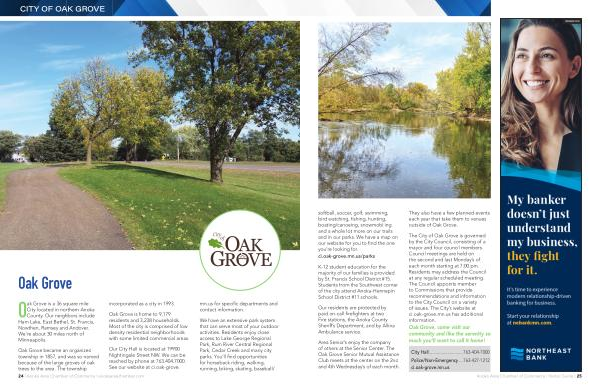 The City of Oak Grove is governed by the City Council, consisting of a mayor and four council members. Council meetings are held on the second and last Monday’ s of each month starting at 7:00 pm. Residents may address the Council at any regular scheduled meeting. The Council appoints member to Commissions that provide recommendations and information to the City Council on a variety of issues. The City’ s website at ci. oak-grove. mn. us has additional information. Oak Grove, come visit our community and like the serenity so much you’ ll want to call it home!