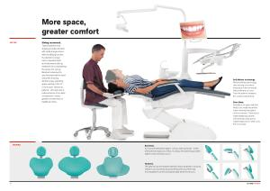Sliding movement . Tapered patient chair shaping provides dentists with optimal ergonomics . With the Sliding function the dentist no longer has to reposition light and instruments during treatment , thus maintaining the work zone set-up . Backrest movement is synchronised with forward seat shift , ensuring dentists enjoy operating space savings in the 12 o ’ clock zone . Moreover , patients - who perceive a reduced sense of on-back compression - enjoy greater comfort than on traditional chairs .