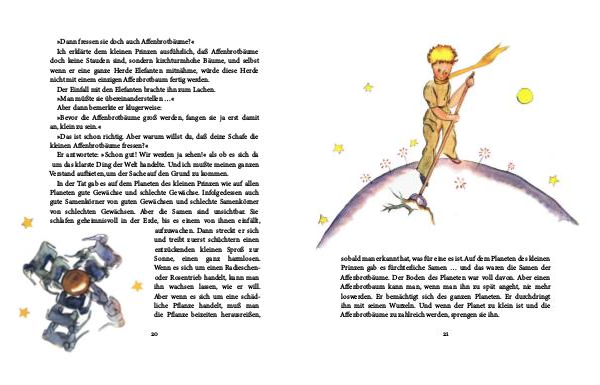 In der Tat gab es auf dem Planeten des kleinen Prinzen wie auf allen Planeten gute Gewächse und schlechte Gewächse. Infolgedessen auch gute Samenkörner von guten Gewächsen und schlechte Samenkörner von schlechten Gewächsen. Aber die Samen sind unsichtbar. Sie schlafen geheimnisvoll in der Erde, bis es einem von ihnen einfällt, aufzuwachen. Dann streckt er sich und treibt zuerst schüchtern einen entzückenden kleinen Sproß zur Sonne, einen ganz harmlosen. Wenn es sich um einen Radieschenoder Rosentrieb handelt, kann man ihn wachsen lassen, wie er will. Aber wenn es sich um eine schädliche Pflanze handelt, muß man die Pflanze beizeiten herausreißen,