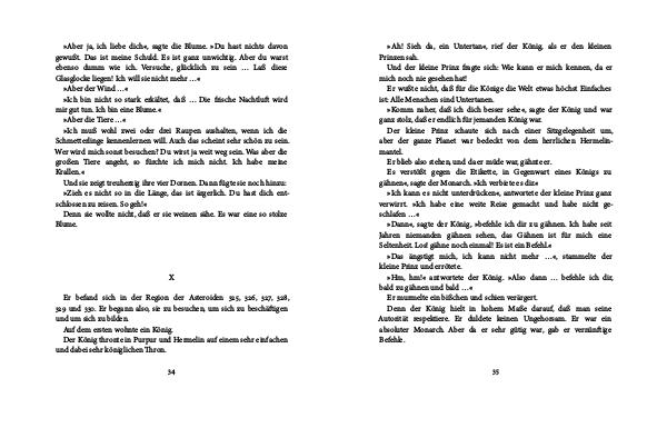 Der kleine Prinz schaute sich nach einer Sitzgelegenheit um, aber der ganze Planet war bedeckt von dem herrlichen Hermelinmantel. Er blieb also stehen, und da er müde war, gähnte er. Es verstößt gegen die Etikette, in Gegenwart eines Königs zu gähnen «, sagte der Monarch. » Ich verbiete es dir.«