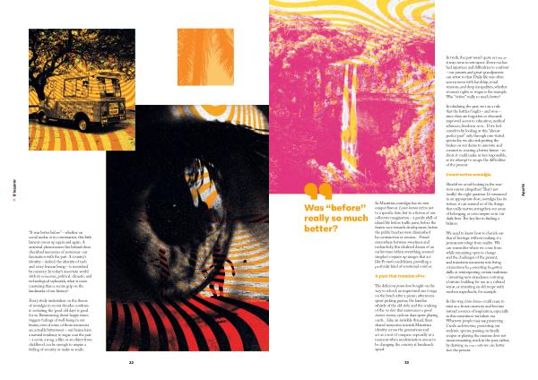 In Mauritius, nostalgia has its own unique flavour. Letan lontan refers not to a specific date, but to a fiction of our collective imagination – a gentle idyll of island life before traffic jams, before the frantic race towards development, before the public beaches were diminished by construction or erosion... Poised somewhere between sweetness and melancholy, this idealised dream of an earlier time( when everything seemed simpler) conjures up images that act like Proust’ s madeleines, providing a particular kind of emotional comfort.