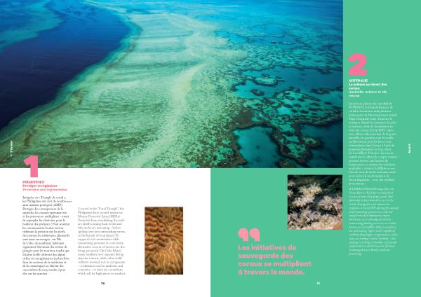 Intégrées au « Triangle de corail », les Philippines ont créé de nombreuses aires marines protégées( AMP). Protégés des conséquences de la surpêche, les coraux reprennent vie et les poissons se multiplient – avant de repeupler les alentours, pour le bonheur des pêcheurs! Pour soutenir les communautés locales tout en réduisant la pression sur les récifs, des moyens de subsistance alternatifs sont aussi encouragés: sur l’ île de Cebu, de nombreux habitants organisent désormais des sorties de plongée pour les touristes, tandis que d’ autres atolls cultivent des algues riches en carraghénanes( recherchées dans les secteurs de la médecine et de la cosmétique) ou élèvent des concombres de mer, vendus à prix d’ or sur les marchés.