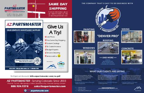 SAME DAY SHIPPING AZ PARTSMASTER YOUR COMPLETE MAINTENANCE SUPPLIER For more information, please call 1-888-476-3580, ext 1336 or sales@azpartsmaster.com 11600 E. 53rd Ave., Suite C Denver, Colorado 80239 Give Us A Try! √ Low Prices √ Free Same Day Shipping √ Custom Catalogs √ GL Coded Invoices √ Budget Reports √ On-Line Ordering √ Service with a Thousands of everyday items in stock! FREE same-day local delivery. Proud members of: PROTECT EDUCATE NETWORK OF SOUTHERN COLORADO 2014-2015 • b2b.azpartsmaster.com • 1-888-924-7278 Serving the RENTAL HOUSING INDUSTRY Since 1970 To Open an Account: b2b.azpartsmaster.com/ca.pdf AZ PARTSMASTER - Serving Colorado Since 2003 Phoenix, Tucson, Albuquerque, Dallas, Oklahoma City, Colorado Springs, Denver 888.924.7278 sales@azpartsmaster.com b2b.azpartsmaster.com