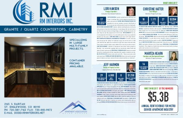 TV SHOW OR MOVIE DESCRIBES WORK / LIFE BALANCE: All in the Family. COFFEE OR COCKTAIL: Grey Goose and cranberry, or a good microbrew. FAVORITE NON-RESTAURANT DENVER SPOT: Any or all the pro sports venues. WHY APARTMENTS? The people I get to work with and that we provide home to thousands of families. WRITE A FORTUNE COOKIE FORTUNE:“ If it feels, do it good!” NEW TECHNOLOGY TO MAKE JOB EASIER: Ability to beam myself to other states and back. YOUR FIRST APARTMENT: 2 bed 2 bath, 3rd floor with shag carpet and a balcony at Iliff and Quebec. KEEPS YOU UP AT NIGHT: World affairs and the quality of life my children will have. STORE IN MALL TO FIND NEW TALENT: Nordstrom. ERA OF LIFE TO RE-LIVE: Early to mid-20’ s. Carefree, no stress, just enjoying life with no strings! POTENTIAL 2019 WHO’ S WHO QUESTION: What vision do you have for 20 / 20?