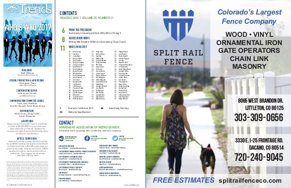 Apartment Trends( USPS 018-233) is published 11 times a year( monthly except for the combined November / December issue) by The Apartment Association of Metro Denver, 7100 E. Belleview Ave., Suite 305, Greenwood Village, CO 80111. Periodicals Postage Paid at Englewood, CO and additional offices. POSTMASTER: Send address changes to Apartment Trends c / o The Apartment Association of Metro Denver, 7100 E. Belleview Ave., Suite 305, Greenwood Village, CO 80111. Subscription included in membership dues. Apartment Trends is published as a service to its members and all segments of the apartment industry by The Apartment Association of Metro Denver. Any reproduction or copying in whole or in part, without permission, is prohibited. Articles and events herein do not necessarily have the endorsement of AAMD but may be presented to give readers a diversity of views and activity updates. 7100 E. Belleview Ave., Suite 305, Greenwood Village, CO 80111, Phone( 303) 329-3300, Fax( 303) 329-0403, E-mail: info @ aamdhq. org, Web: www. aamdhq. org. AAMD is a taxexempt professional trade association representing the multifamily housing industry in the metropolitan Denver area. AAMD is affiliated with The Colorado Apartment Association( www. caahq. org) and The National Apartment Association( www. naahq. org).