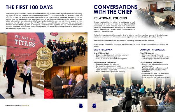 This100-dayplanoutlinestheprocessIfolowedtoaddresskeyprioritiesforthedepartmentandthecommunity. Myobjectivesweretocontinuetobuildrelationshipswithinourcommunity, review andevaluatepoliciesand practicestomakeourworkforcemoreef�cientandefective, respondtotheimmediateneedsofourof�cers, communities, andstakeholders, andreportinformationtoourof�cersandinitiativestothepublic. Thesefour pilarswildrivehow wepoliceAlexandriaforwardandarticulatetheworkwearedoingtoengageinthese processesthatwilextendbeyondday100. Theoutcomessharedinthisplanrepresentthe�rststepinour colectiveandcolaborativejourneytostrengthenpublicsafetyforeveryoneinourcity. Iremaincommitedto providingthehighestlevelofpublicservicebyempoweringourof�cersandstafwithsolutionstoaddresscrime andsafetyconcernsacrossourcity.