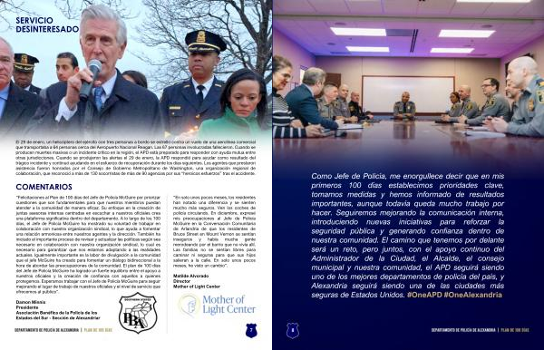 ComoJefedePolicía, meenorgulecedecirqueenmis primeros 100 días establecimos prioridades clave, tomamos medidas y hemos informado de resultados importantes, aunquetodavíaquedamuchotrabajopor hacer. Seguiremosmejorandolacomunicacióninterna, introduciendo nuevas iniciativas para reforzar la seguridad pública y generando con�anza dentro de nuestracomunidad. Elcaminoquetenemospordelante seráun reto, pero juntos, con elapoyo continuo del Administrador de la Ciudad, elAlcalde, elconsejo municipalynuestracomunidad, elAPD seguirásiendo unodelosmejoresdepartamentosdepolicíadelpaís, y Alexandria seguirá siendo una de las ciudades más segurasdeEstadosUnidos.# OneAPD # OneAlexandria