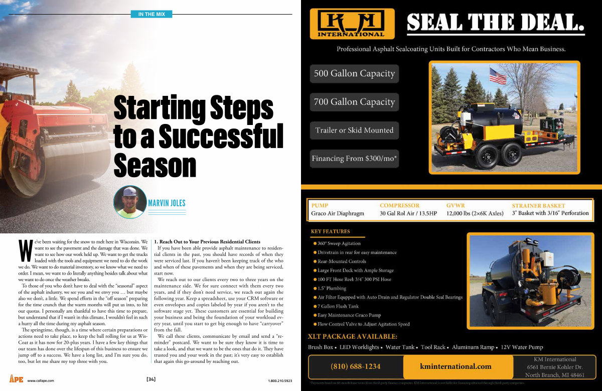 We’ ve been waiting for the snow to melt here in Wisconsin. We want to see the pavement and the damage that was done. We want to see how our work held up. We want to get the trucks loaded with the tools and equipment we need to do the work we do. We want to do material inventory, so we know what we need to order. I mean, we want to do literally anything besides talk about what we want to do once the weather breaks. To those of you who don’ t have to deal with the“ seasonal” aspect of the asphalt industry, we see you and we envy you … but maybe also we don’ t, a little. We spend efforts in the“ off season” preparing for the time crunch that the warm months will put us into, to hit our quotas. I personally am thankful to have this time to prepare, but understand that if I wasn’ t in this climate, I wouldn’ t feel in such a hurry all the time during my asphalt season. The springtime, though, is a time where certain preparations or actions need to take place, to keep the ball rolling for us at Wis- Coat as it has now for 20-plus years. I have a few key things that our team has done over the lifespan of this business to ensure we jump off to a success. We have a long list, and I’ m sure you do, too, but let me share my top three with you.