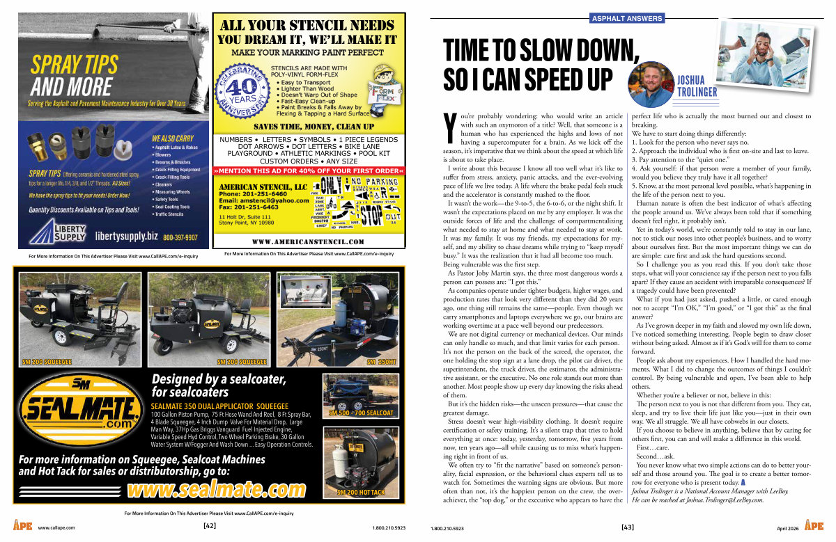 Y ou’ re probably wondering: who would write an article with such an oxymoron of a title? Well, that someone is a human who has experienced the highs and lows of not having a supercomputer for a brain. As we kick off the season, it’ s imperative that we think about the speed at which life is about to take place. I write about this because I know all too well what it’ s like to suffer from stress, anxiety, panic attacks, and the ever-evolving pace of life we live today. A life where the brake pedal feels stuck and the accelerator is constantly mashed to the floor. It wasn’ t the work— the 9-to-5, the 6-to-6, or the night shift. It wasn’ t the expectations placed on me by any employer. It was the outside forces of life and the challenge of compartmentalizing what needed to stay at home and what needed to stay at work. It was my family. It was my friends, my expectations for myself, and my ability to chase dreams while trying to“ keep myself busy.” It was the realization that it had all become too much. Being vulnerable was the first step. As Pastor Joby Martin says, the three most dangerous words a person can possess are:“ I got this.” As companies operate under tighter budgets, higher wages, and production rates that look very different than they did 20 years ago, one thing still remains the same— people. Even though we carry smartphones and laptops everywhere we go, our brains are working overtime at a pace well beyond our predecessors. We are not digital currency or mechanical devices. Our minds can only handle so much, and that limit varies for each person. It’ s not the person on the back of the screed, the operator, the one holding the stop sign at a lane drop, the pilot car driver, the superintendent, the truck driver, the estimator, the administrative assistant, or the executive. No one role stands out more than another. Most people show up every day knowing the risks ahead of them. But it’ s the hidden risks— the unseen pressures— that cause the greatest damage. Stress doesn’ t wear high-visibility clothing. It doesn’ t require certification or safety training. It’ s a silent trap that tries to hold everything at once: today, yesterday, tomorrow, five years from now, ten years ago— all while causing us to miss what’ s happening right in front of us. We often try to“ fit the narrative” based on someone’ s personality, facial expression, or the behavioral clues experts tell us to watch for. Sometimes the warning signs are obvious. But more often than not, it’ s the happiest person on the crew, the overachiever, the“ top dog,” or the executive who appears to have the perfect life who is actually the most burned out and closest to breaking. We have to start doing things differently: 1. Look for the person who never says no. 2. Approach the individual who is first on-site and last to leave. 3. Pay attention to the“ quiet one.” 4. Ask yourself: if that person were a member of your family, would you believe they truly have it all together? 5. Know, at the most personal level possible, what’ s happening in the life of the person next to you. Human nature is often the best indicator of what’ s affecting the people around us. We’ ve always been told that if something doesn’ t feel right, it probably isn’ t. Yet in today’ s world, we’ re constantly told to stay in our lane, not to stick our noses into other people’ s business, and to worry about ourselves first. But the most important things we can do are simple: care first and ask the hard questions second. So I challenge you as you read this. If you don’ t take those steps, what will your conscience say if the person next to you falls apart? If they cause an accident with irreparable consequences? If a tragedy could have been prevented? What if you had just asked, pushed a little, or cared enough not to accept“ I’ m OK,”“ I’ m good,” or“ I got this” as the final answer? As I’ ve grown deeper in my faith and slowed my own life down, I’ ve noticed something interesting. People begin to draw closer without being asked. Almost as if it’ s God’ s will for them to come forward. People ask about my experiences. How I handled the hard moments. What I did to change the outcomes of things I couldn’ t control. By being vulnerable and open, I’ ve been able to help others. Whether you’ re a believer or not, believe in this: The person next to you is not that different from you. They eat, sleep, and try to live their life just like you— just in their own way. We all struggle. We all have cobwebs in our closets. If you choose to believe in anything, believe that by caring for others first, you can and will make a difference in this world. First … care. Second … ask. You never know what two simple actions can do to better yourself and those around you. The goal is to create a better tomorrow for everyone who is present today. Joshua Trolinger is a National Account Manager with LeeBoy. He can be reached at Joshua. Trolinger @ LeeBoy. com.