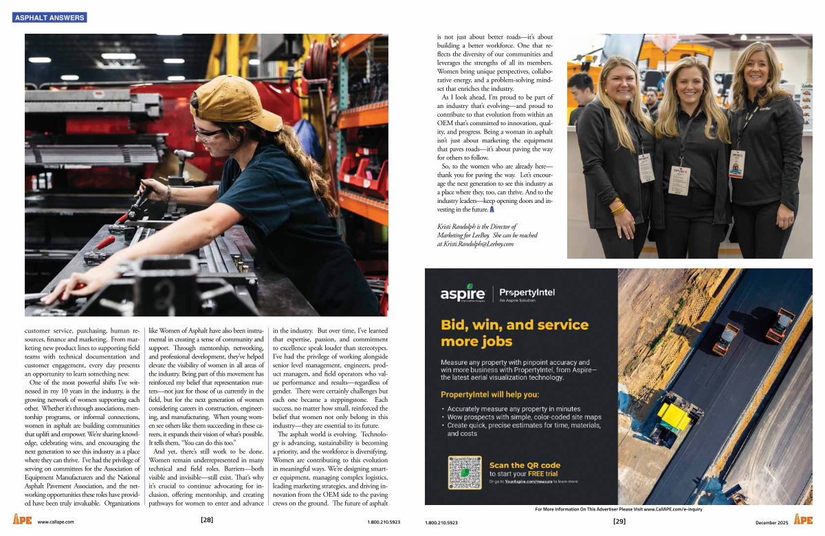 customer service, purchasing, human resources, finance and marketing. From marketing new product lines to supporting field teams with technical documentation and customer engagement, every day presents an opportunity to learn something new. One of the most powerful shifts I’ ve witnessed in my 10 years in the industry, is the growing network of women supporting each other. Whether it’ s through associations, mentorship programs, or informal connections, women in asphalt are building communities that uplift and empower. We’ re sharing knowledge, celebrating wins, and encouraging the next generation to see this industry as a place where they can thrive. I’ ve had the privilege of serving on committees for the Association of Equipment Manufacturers and the National Asphalt Pavement Association, and the networking opportunities these roles have provided have been truly invaluable. Organizations like Women of Asphalt have also been instrumental in creating a sense of community and support. Through mentorship, networking, and professional development, they’ ve helped elevate the visibility of women in all areas of the industry. Being part of this movement has reinforced my belief that representation matters— not just for those of us currently in the field, but for the next generation of women considering careers in construction, engineering, and manufacturing. When young women see others like them succeeding in these careers, it expands their vision of what’ s possible. It tells them,“ You can do this too.” And yet, there’ s still work to be done. Women remain underrepresented in many technical and field roles. Barriers— both visible and invisible— still exist. That’ s why it’ s crucial to continue advocating for inclusion, offering mentorship, and creating pathways for women to enter and advance in the industry. But over time, I’ ve learned that expertise, passion, and commitment to excellence speak louder than stereotypes. I’ ve had the privilege of working alongside senior level management, engineers, product managers, and field operators who value performance and results— regardless of gender. There were certainly challenges but each one became a steppingstone. Each success, no matter how small, reinforced the belief that women not only belong in this industry— they are essential to its future. The asphalt world is evolving. Technology is advancing, sustainability is becoming a priority, and the workforce is diversifying. Women are contributing to this evolution in meaningful ways. We’ re designing smarter equipment, managing complex logistics, leading marketing strategies, and driving innovation from the OEM side to the paving crews on the ground. The future of asphalt