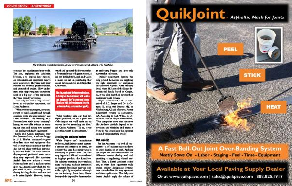 company , but standards industry-wide . The aim , explained the Andersen brothers , is to impress their customers with service and equipment they ’ ve never seen before . They have built their business on honesty , professionalism , and unmatched quality . They understand that supporting their customers ’ needs is a big part of the reputation they have proudly developed . That ’ s why it ’ s been so important to invest in top-quality equipment , said Derek Andersen . “ When we were starting out , it was important to build a great brand through consistent work and great service ,” said Derek Andersen . “ By investing in a PavementSaver early in our company ’ s history , we were able to focus on training our team and earning new business -- not dealing with faulty equipment .” Derek and Caden purchased their first PavementSaver , a seal coat buggy in 2016 . They ’ ve continued to grow their fleet since with equipment that will not only run consistently day after day , but will align with their extremely high standards . The PavementSaver , they reported , performed even better than they expected . The Andersen Asphalt fleet now includes a second PavementSaver and a truck-mounted spray rig , a RaynMaker , which the two purchased in 2020 . Investing in machinery is a big decision and not one to be taken lightly . However , having