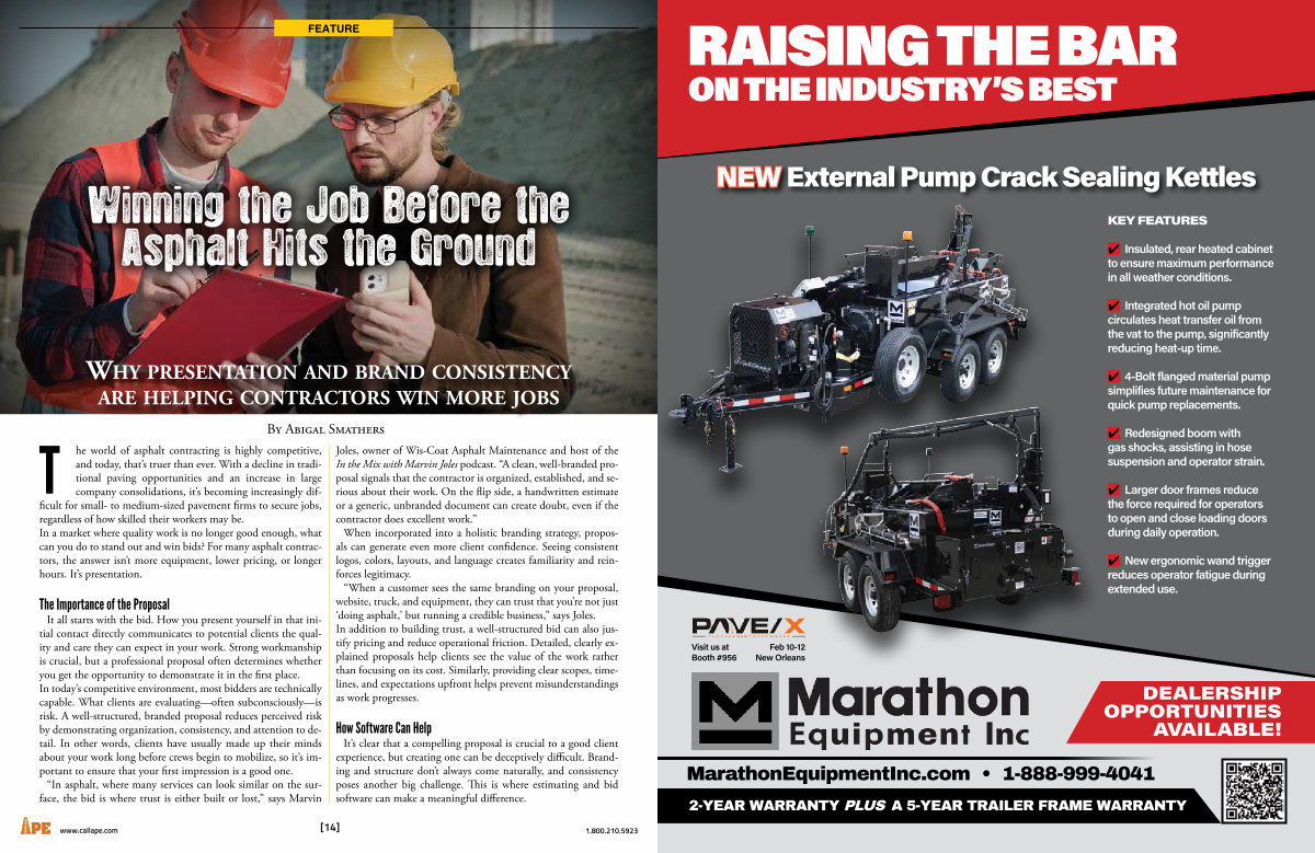 Joles, owner of Wis-Coat Asphalt Maintenance and host of the In the Mix with Marvin Joles podcast.“ A clean, well-branded proposal signals that the contractor is organized, established, and serious about their work. On the flip side, a handwritten estimate or a generic, unbranded document can create doubt, even if the contractor does excellent work.” When incorporated into a holistic branding strategy, proposals can generate even more client confidence. Seeing consistent logos, colors, layouts, and language creates familiarity and reinforces legitimacy.“ When a customer sees the same branding on your proposal, website, truck, and equipment, they can trust that you’ re not just‘ doing asphalt,’ but running a credible business,” says Joles. In addition to building trust, a well-structured bid can also justify pricing and reduce operational friction. Detailed, clearly explained proposals help clients see the value of the work rather than focusing on its cost. Similarly, providing clear scopes, timelines, and expectations upfront helps prevent misunderstandings as work progresses.