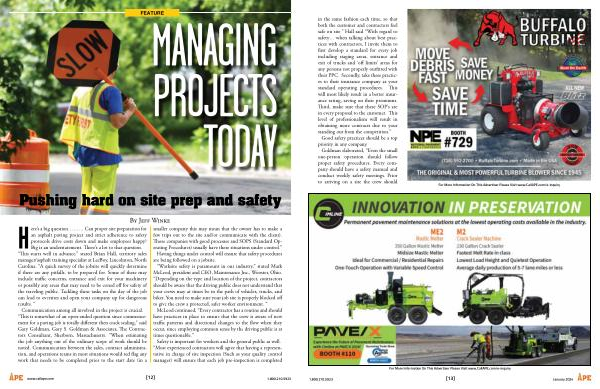 Here ’ s a big question ……… Can proper site preparation for an asphalt paving project and strict adherence to safety protocols drive costs down and make employees happy ? Big is an understatement . There ’ s a lot to that question . “ This starts well in advance ,” stated Brian Hall , territory sales manager / asphalt training specialist at LeeBoy , Lincolnton , North Carolina . “ A quick survey of the jobsite will quickly determine if there are any pitfalls . to be prepared for . Some of these may include traffic concerns , entrance and exit for your machinery or possibly any areas that may need to be coned off for safety of the traveling public . Tackling these tasks on the day of the job can lead to oversites and open your company up for dangerous results . “ Communication among all involved in the project is crucial . “ This is somewhat of an open-ended question since commencement for a paving job is totally different then crack sealing ,” said Gary Goldman , Gary S . Goldman & Associates , The Contractors Consultant , Sherborn , Massachusetts . “ When estimating the job anything out of the ordinary scope of work should be noted . Communication between the sales , contract administration , and operations teams in most situations would red flag any work that needs to be completed prior to the start date ( in a
